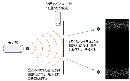 粒子がどちらのスリットを通過したかを観測すると、それまで波のように広がっていた性質は失われ、粒子としてのふるまいが現れます。