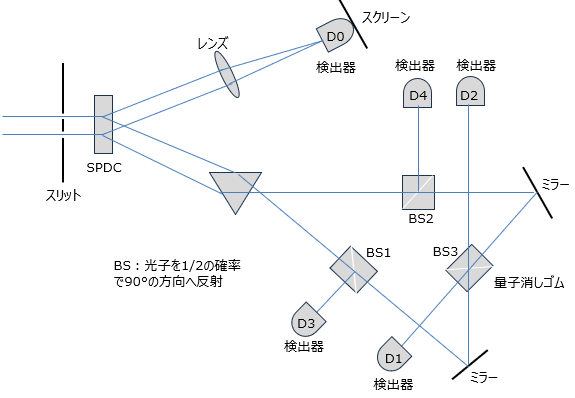 上記の実験装置において、検出器D1~D4までの到達距離をD0より十分に長く設定し、光子がD0に先に到達するようにします。