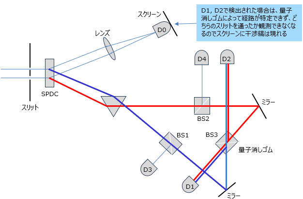 D3、D4の検出器に光子が観測された場合、光子が通ってくる経路が一つしかない為、どちらのスリットを通ったかが特定できます。従ってこの場合はスクリーンに干渉縞は現れません。