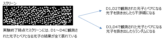 その後、D1・D2で検出された光子と対になるものだけを抜き出せば干渉縞が現れ、D3・D4で検出された光子と対になるものを抜き出せばランダムな分布になります。